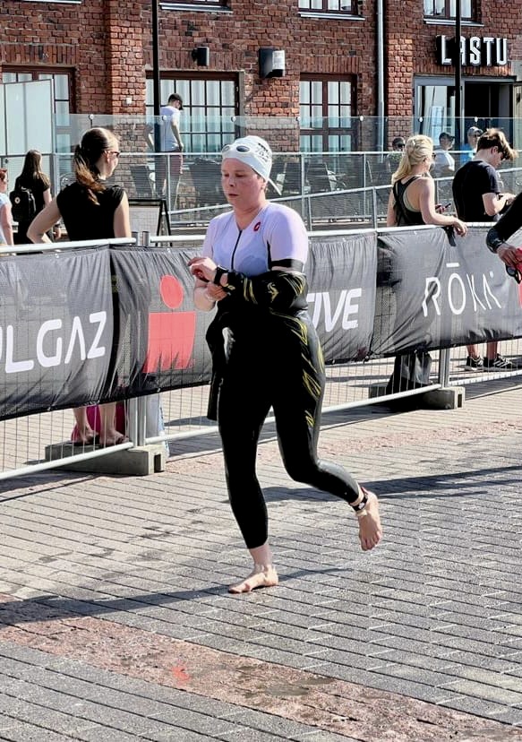Tänä vuonna, kun koronarajoituksia ei enää ollut, saimme odotella lähtöä viileässä Sibelius-talossa. Olin rauhallisin mielin ja hyvällä fiiliksellä. Uinnissa oli rolling start, eli kiirettä lähtöjonoon ei ollut. Matkalla lähtöön kävin pulahtamassa järvessä; vesi tuntui ihanan virkistävältä. Tunnelma muuttui kuitenkin dramaattisesti 30 metriä ennen lähtöviivaa. Garmin meni jumiin eikä suostunut inahtamaan mihinkään suuntaan. Apuun tulivat Riikka ja Ville; hekään eivät saaneet elvytettyä kelloa. Tässä vaiheessa alkoi lämpö ja syke nousta; miten ihmeessä pärjään ilman kelloa tämän reissun? Sitten ihana Riikka tarjosi omaa kelloaan lainaan ja Ville näppäränä miehenä sai sen nopeasti synkattua minun vyöhöni. Itse en olisi ilman silmälaseja selvinnyt tuosta hommasta. Tämä säätö pelasti kyllä kisani, vaikka aikaa siihen toki meni ja tästä johtuen lähdin uimaan pitkältä takamatkalta kaikkien uimareiden perään.