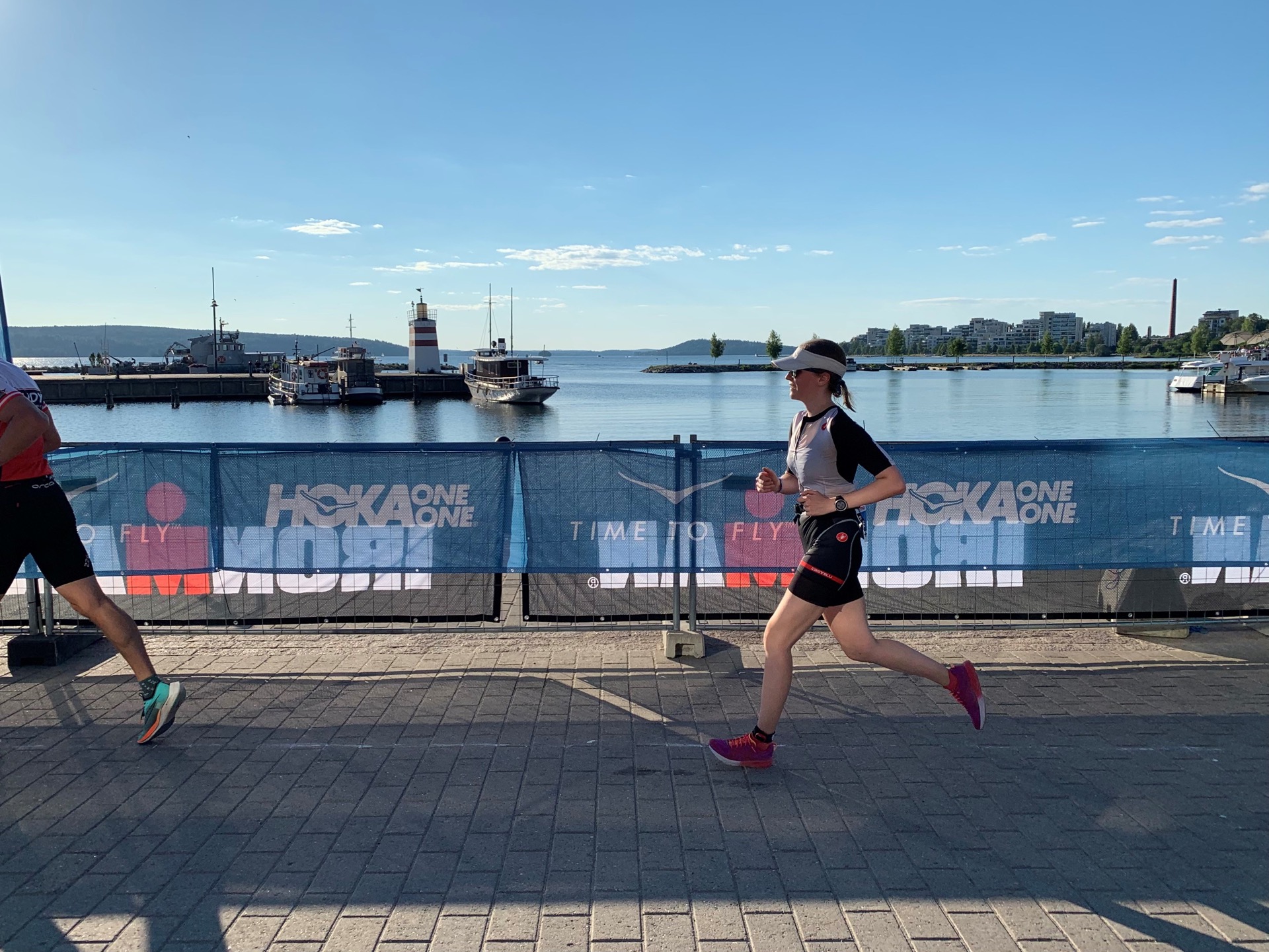 Söin energiamarmeladeja puolen tunnin välein ja join elektrolyyttijuomaa tiuhaan. Enemmänkin olisi voinut ottaa energiaa, sillä maha alkoi kurnia nälästä puolivälin kohdalla. Kaadoin selkään aina välillä vettä viilennykseksi, aerokypärän sisään sitä ei valitettavasti juurikaan saanut umpinaisuuden vuoksi. Peesiletkoja en nähnyt, kierroksia nostattivat ainoastaan tarkoituksellisesti roskannut kisaaja ja keskiviivan väärällä puolella jatkuvasti seikkaillut sankari. Ajoin koko 90 kilometrin pyöräilyn (2:59:40) VK1-sykealueella, jolla fiilis pysyi vielä rentona, toteutuneet tehot (76%FTP) jäivät hieman alakanttiin tavoitteesta.